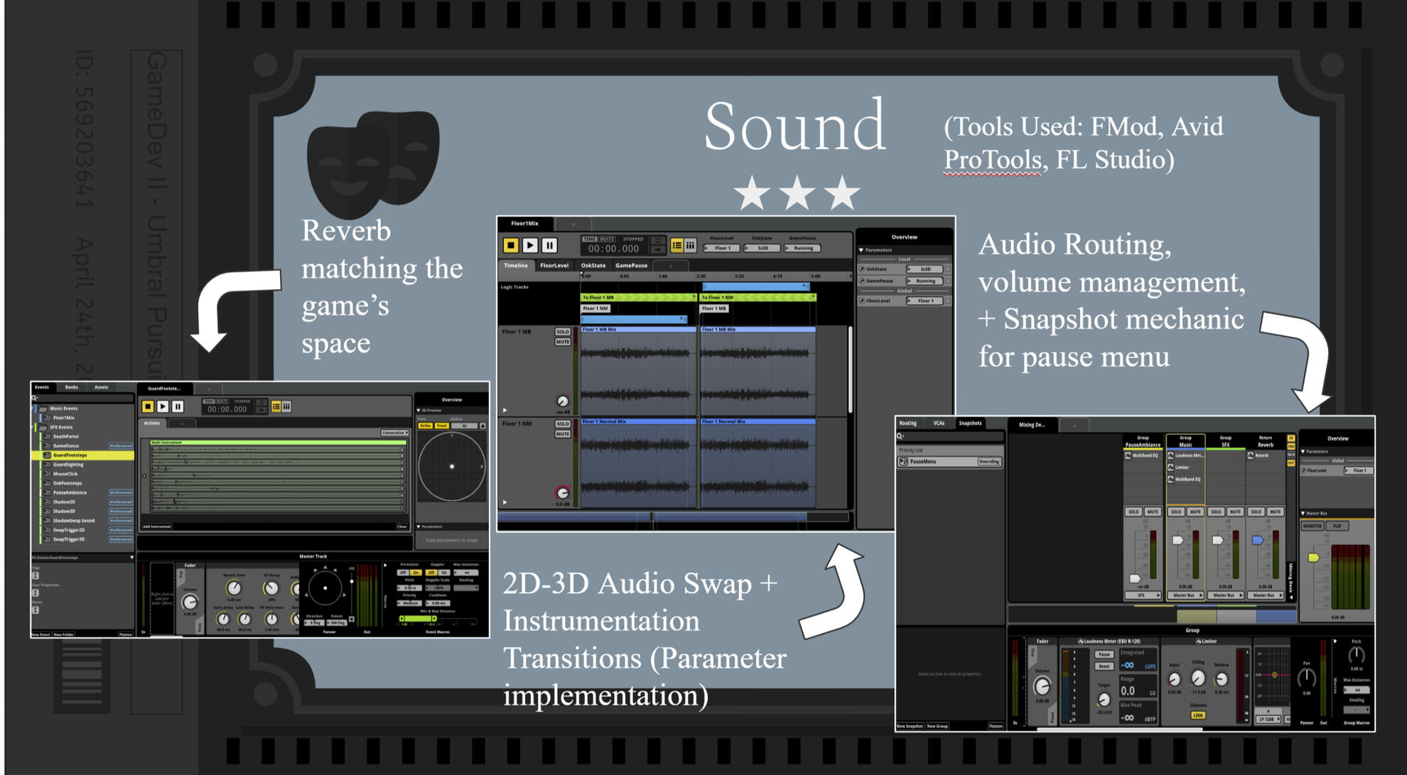 This game was created in Unity as a project for Rensselaer Polytechnic Institute's Game Development 2 course. I created and implemented all music and sound for this project using FMod, FL Studio, and Avid ProTools.Umbral Pursuit is a stealth based roguelike game where you play as Osk, the master of shadows. Reclaim what was once yours by sneaking around the Light Mage's mansion, morphing into shadows, and assassinating guards.